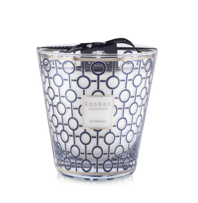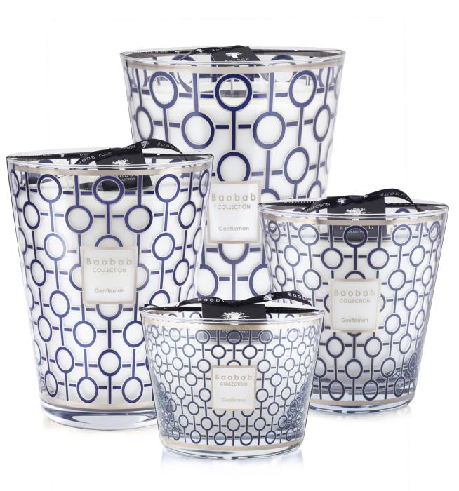 Sérigraphié d’un motif graphique rappelant le signe du féminin, nous avons choisi pour la bougie parfumée Gentlemen des couleurs sobres inspirées par le vestiaire masculin : du bleu marine bordé de platine.