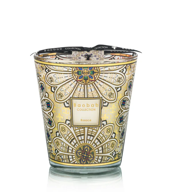 La bougie Rosace rend hommage à l’architecture gothique et à la lumière spirituelle des cathédrales. Son verre est recouvert d’une sérigraphie précieuse, où l’or et les couleurs subtiles dessinent des motifs inspirés des rosaces médiévales. Comme une dentelle lumineuse, ce décor raffiné se révèle sur un fond de fleurs de lys, emblème de noblesse et de pureté.