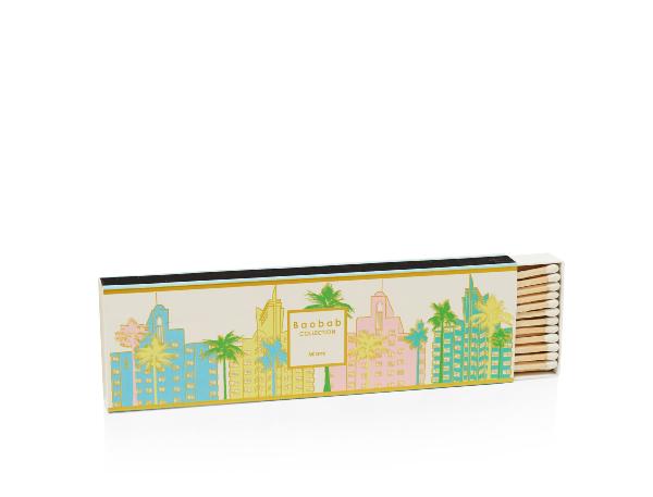 La boite d’Allumettes MIAMI  aux tons pastels et or reprenant l'architecture des immeubles art déco de South Beach.