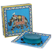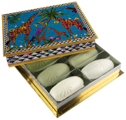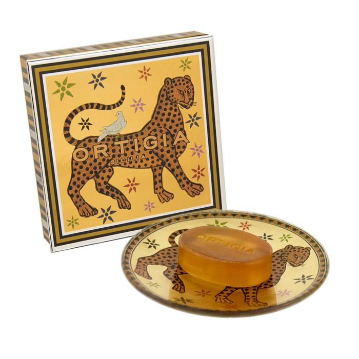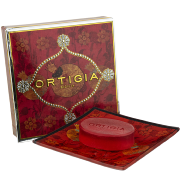 Le cadeau iconique Ortigia, assiette en verre et savon avec impression sérigraphiée Ortigia, présenté dans une belle boîte à feuilles d’or.