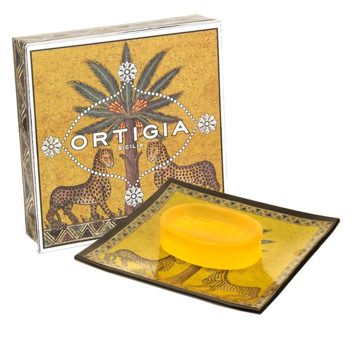 Le cadeau iconique Ortigia, assiette en verre et savon avec impression sérigraphiée Ortigia, présenté dans une belle boîte à feuilles d’or.