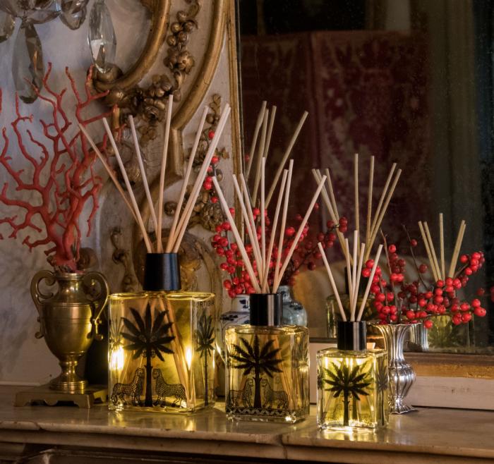 * Les flacons en verre et le pot des bougies parfumés sont estampés d’images évoquant léopards et palmiers.