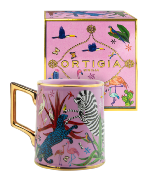 Tasse en céramique décorée à la main avec sérigraphie dorée.