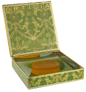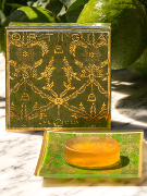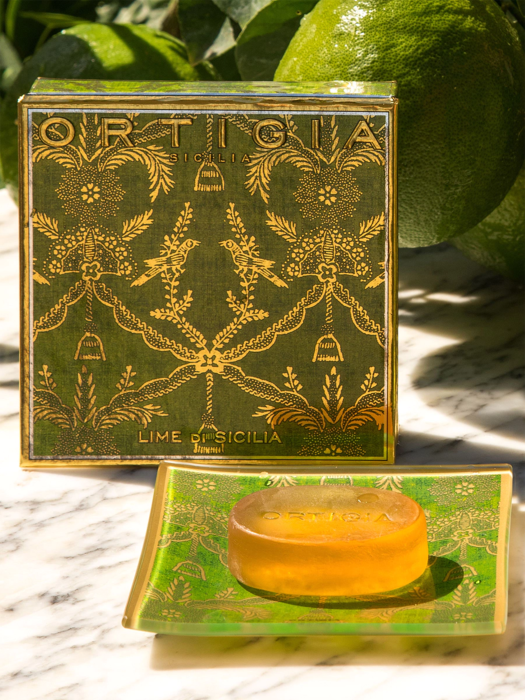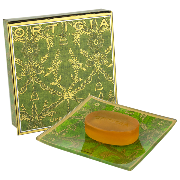 Le cadeau iconique Ortigia, assiette en verre et savon avec impression sérigraphiée Ortigia, présenté dans une belle boîte à feuilles d’or.