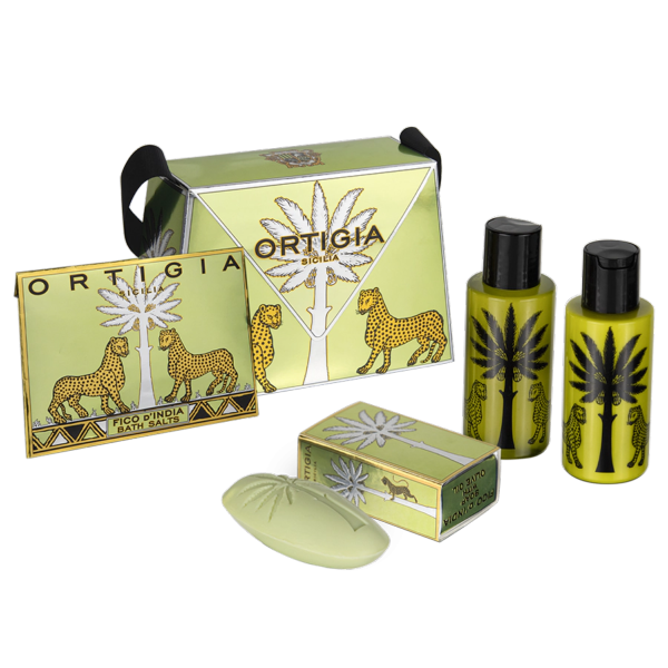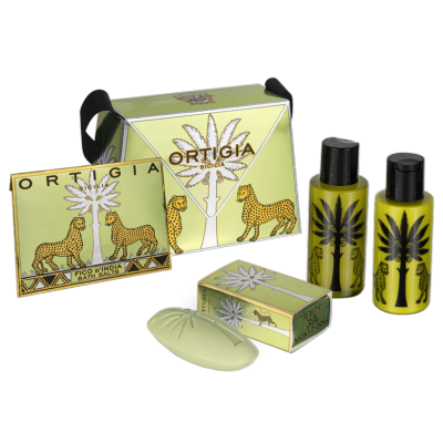 Sacs aux couleurs vives avec intérieur imprimé léopard, contenant les produits parfumés naturels d’Ortigia en miniature, adaptés aux cadeaux ou aux voyages. Le style italien rencontre l’histoire et la magie de la Sicile.