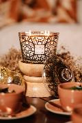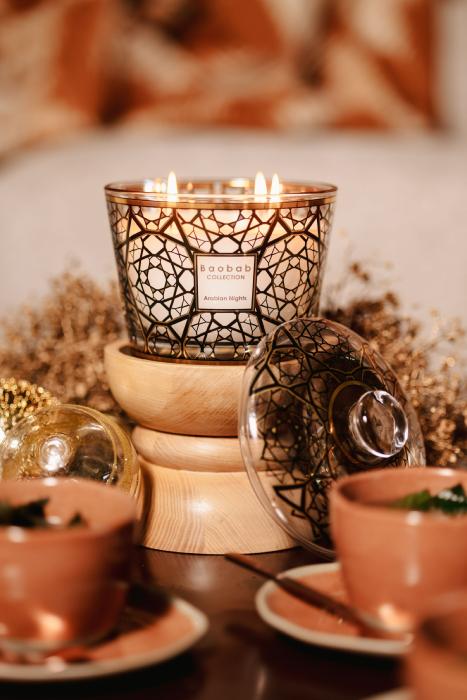 La bougie parfumée Arabian Nights nous transporte dans l’univers mystérieux du Moyen Orient. Le décor de son verre sérigraphié d’or 9 carats s’inspire des célèbres moucharabieh, motifs ajourés que l’on retrouve dans l’architecture arabe. A travers le verre, la flamme apparaît créant tout autour des ombres portées. Le décor, délicatement posé à la main sur le verre dans notre atelier, est placé dans un four à haute température afin que celui-ci puisse adhérer parfaitement à la matière.