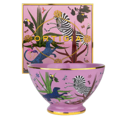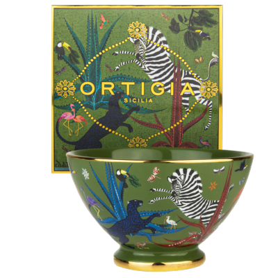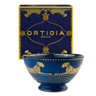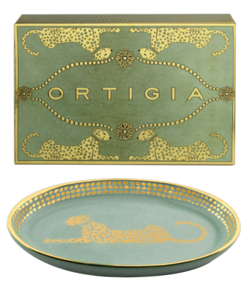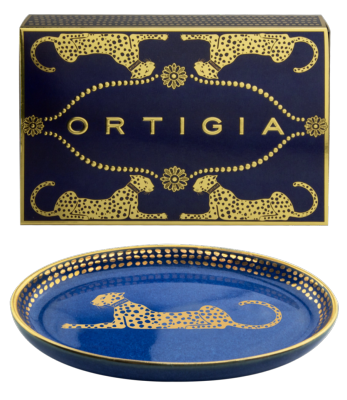 Le cadeau iconique Ortigia, assiette en verre et savon avec impression sérigraphiée, présenté dans une belle boîte à feuilles d’or