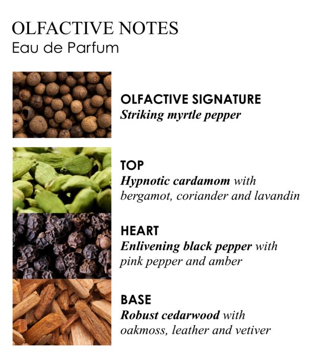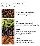 Notes de cœur : Notes vivifiantes, poivre noir, poivre rose, ambre et bois de cèdre.