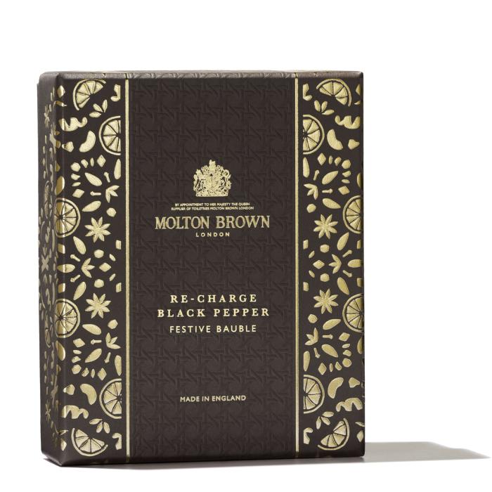 L'emballage de Noël est somptueusement décoré d'un motif de feuilles d'or aux notes hivernales d'agrumes et d'épices festives.