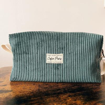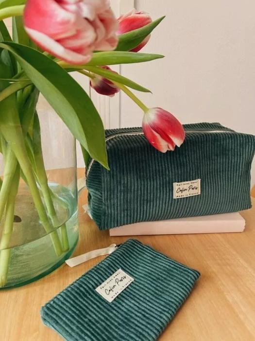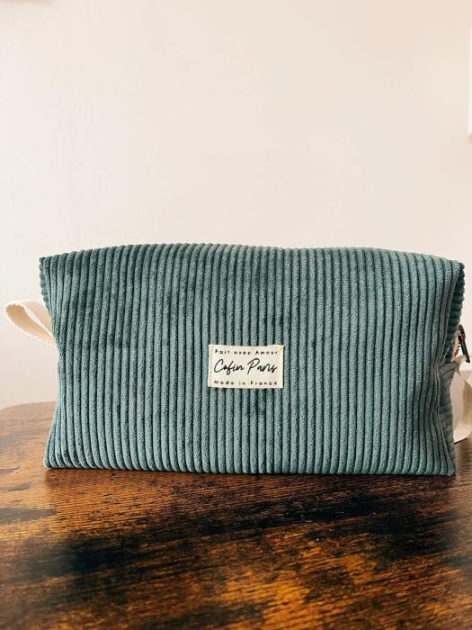 Trousse de toilette en velours côtelé suffisamment grande pour contenir tout votre nécessaire de toilette pour courts ou longs séjours.