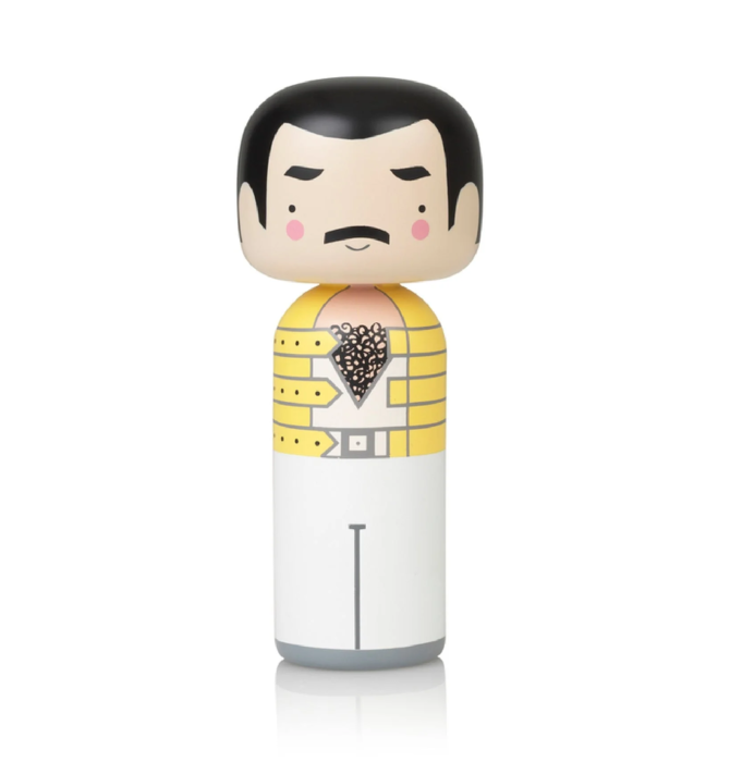 Le design de la poupée kokeshi est basé sur la tenue la plus emblématique de Freddie : la veste militaire jaune qu'il portait lors de la tournée européenne à guichets fermés "Magic" en 1986.