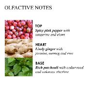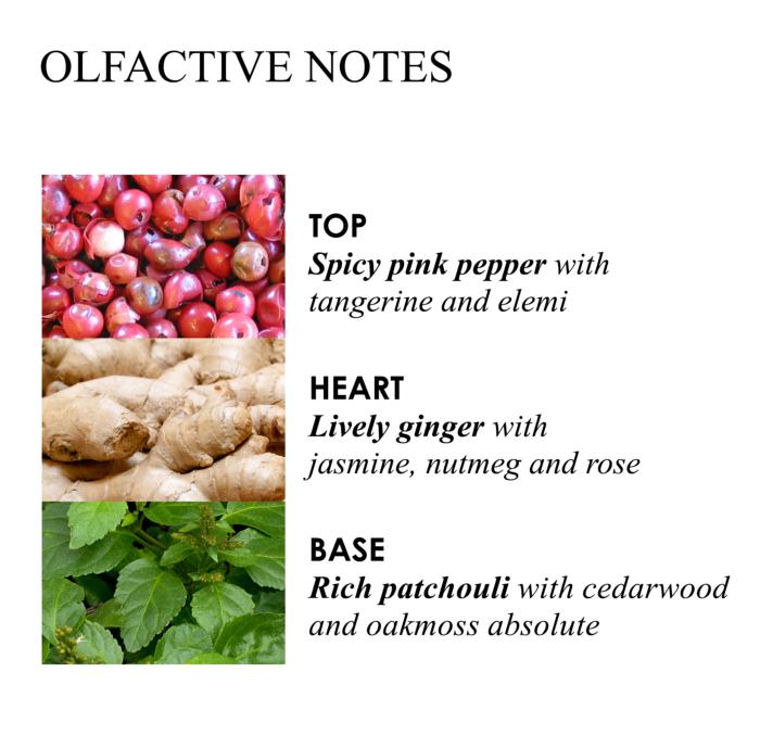Un poivre rose chaleureux et un gingembre vif s’enflamment dans ce parfum envoûtant et très apprécié. Stimulez vos sens aux notes voluptueuses de baies roses épicées, gingembre éclatant et patchouli opulent.