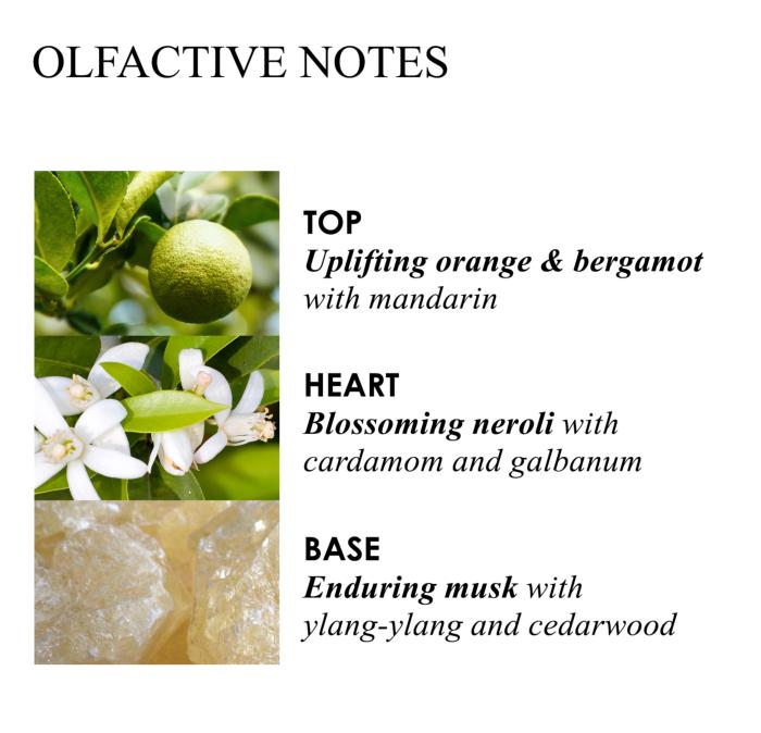 Parfum d’agrumes infusé de notes d’orange et de bergamote vivifiante, de musc et de fleur de néroli.