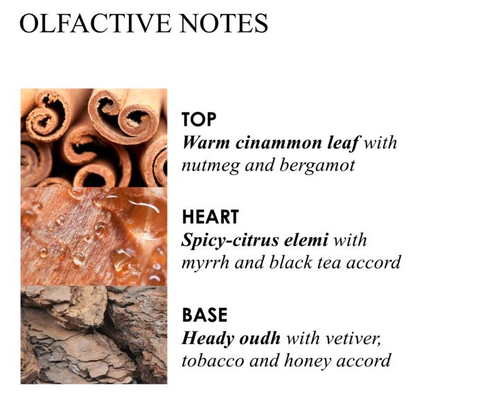 Notes de tête : feuille de cannelle, noix de muscade et bergamote.