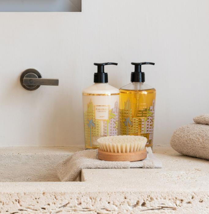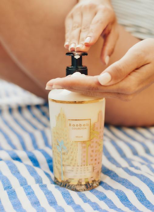 La lotion corps et mains parfumée Miami se place dans les salles de bains tel un objet de décoration.