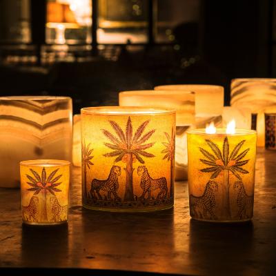 * Les flacons en verre et le pot des bougies parfumés sont estampés d’images évoquant léopards et palmiers.