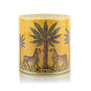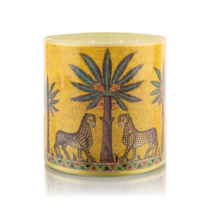 * Les flacons en verre et le pot des bougies parfumés sont estampés d’images évoquant léopards et palmiers.